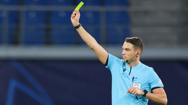 07 December 2021, Saxony, Leipzig: Football, Champions League, RB Leipzig - Manchester City, Group stage, Group A, Matchday 6 at Red Bull Arena. Referee Sandro Schärer shows the yellow card. Photo: Jan Woitas/dpa-Zentralbild/dpa (Photo by Jan Woitas/picture alliance via Getty Images) / picture alliance