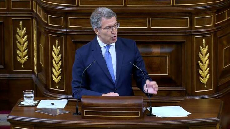 El líder del PP ha utilizado su tono más bronco para tratar de echar por tierra las propuestas del presidente del Gobierno, Pedro Sánchez, que este miércoles ha acudido al Congreso para presentar su plan de regeneración democrática con el que dice que pretende parar los bulos y evitar que los medios tengan más financiadores que lectores y no se puedan comprar "tabloides". "Usted a lo que ha venido aquí es a evitar dar explicaciones y a intentar castigar por ley a los medios que informan sobre la presunta corrupción que a usted le salpica", ha dicho Núñez Feijóo, que ha calificado la comparecencia de Sánchez de "milonga": "La única razón de este debate es que la mujer del presidente está investigada en un juzgado y que su hermano también está en sede judicial. Esto es otra milonga más".