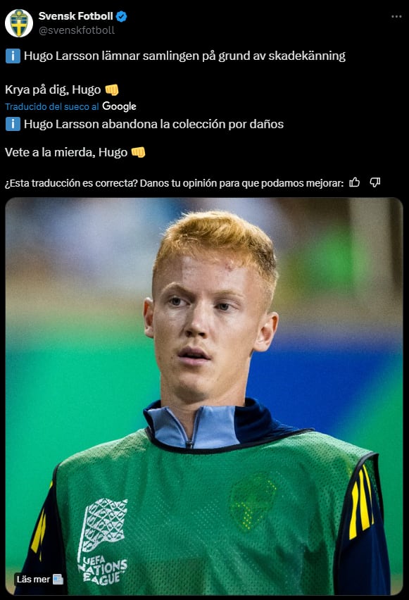 La publicación supera ya las cuatro millones de visualizaciones y no es precisamente por el parte médico de Larsson. Google da una traducción simultánea del mensaje y claramente ha habido un error en la interpretación de las palabras de la selección sueca. "Vete a la mierda, Hugo", figura en la publicación de 'X', haciendo ver que, claramente, la traducción no ha sido la correcta.