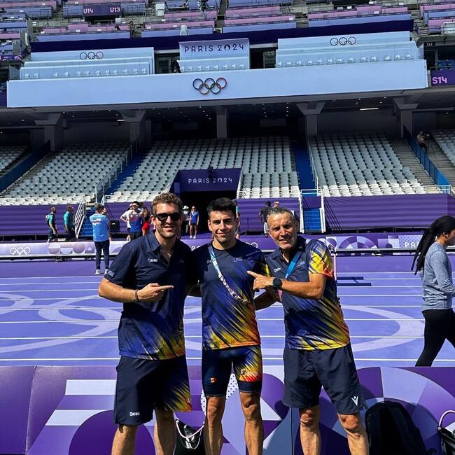 Josep Carballude amb Nahuel Carabaña i Kevin Poulet als jocs de París. / F.A.A.