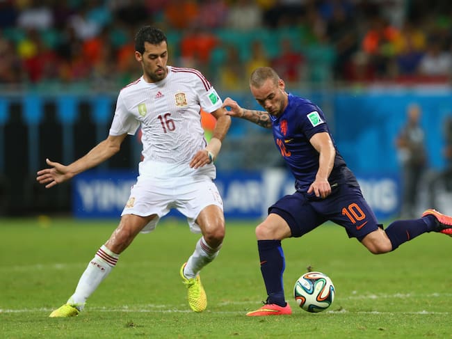 Sergio Busquest pelea un balón con Wesley Sneijder en un partido entre España y Países Bajos del Mundial 2014 / Quinn Rooney