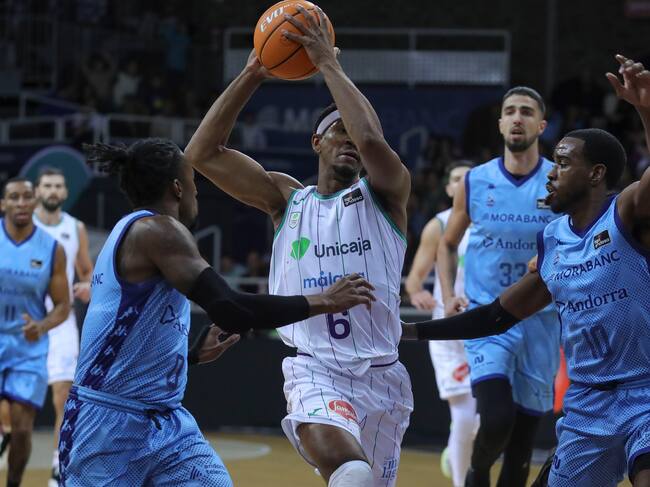 Kameron Taylor (c) , escorta nord-americà de l'Unicaja, es desfà de Shannon Evans i Jerrick Hardin, del MoraBanc, durant el partit de la vuitena jornada de la Lliga Endesa disputat aquest diumenge al polisportiu d'Andorra. / Fernando Galindo (EFE)