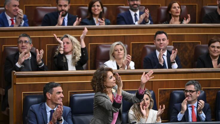 El presidente del Gobierno, Pedro Sánchez, las vicepresidentas María Jesús Montero y Yolanda Díaz (2d) y el ministro de Presidencia, Félix Bolaños aplauden en el pleno celebrado este jueves en el Congreso. / Europa Press