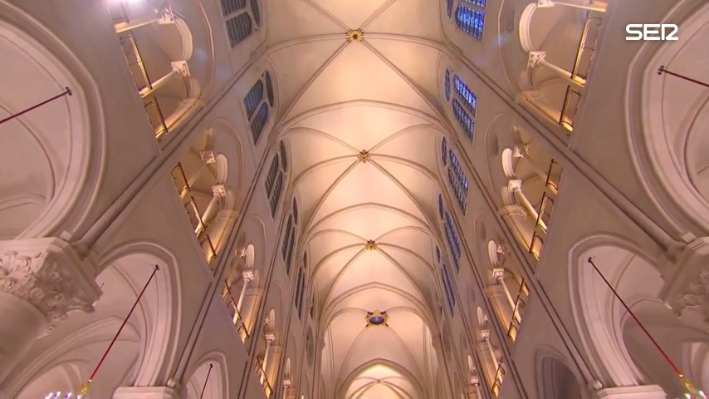 El primer vistazo al nuevo aspecto del interior de Notre Dame de París restaurado tras el incendio de abril de 2019 ha revelado una catedral diáfana de muros blanqueados y resplandecientes.