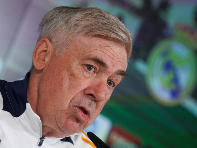 Carlo Ancelotti, entrenador del Real Madrid, en la sala de prensa de Valdebebas / SERGIO PÉREZ (EFE)