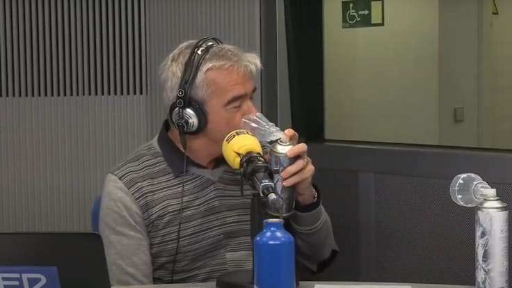 Fernando Bayo ha llevado al programa algunas botellas de la empresa EssentialAir, que vende aire puro de los Pirineos embotellado