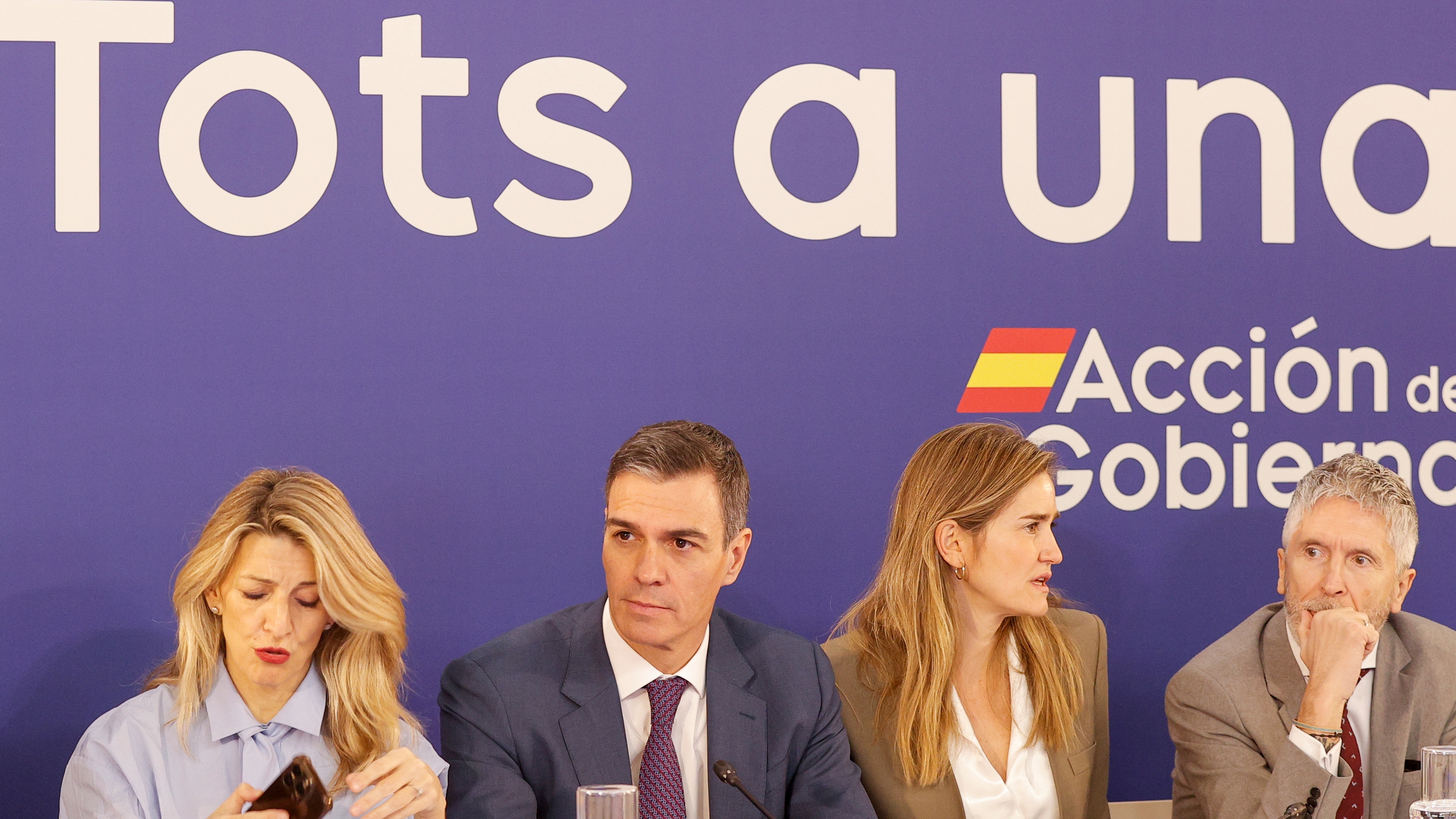 El presidente del Gobierno, Pedro Sánchez, junto a la vicepresidenta segunda y ministra de Trabajo y Economía Social, Yolanda Díaz, la vicepresidenta tercera y ministra para la Transición Ecológica y el Reto Demográfico, Sara Aagesen, y el ministro del Interior, Fernando Grande-Marlaska. / Europa Press