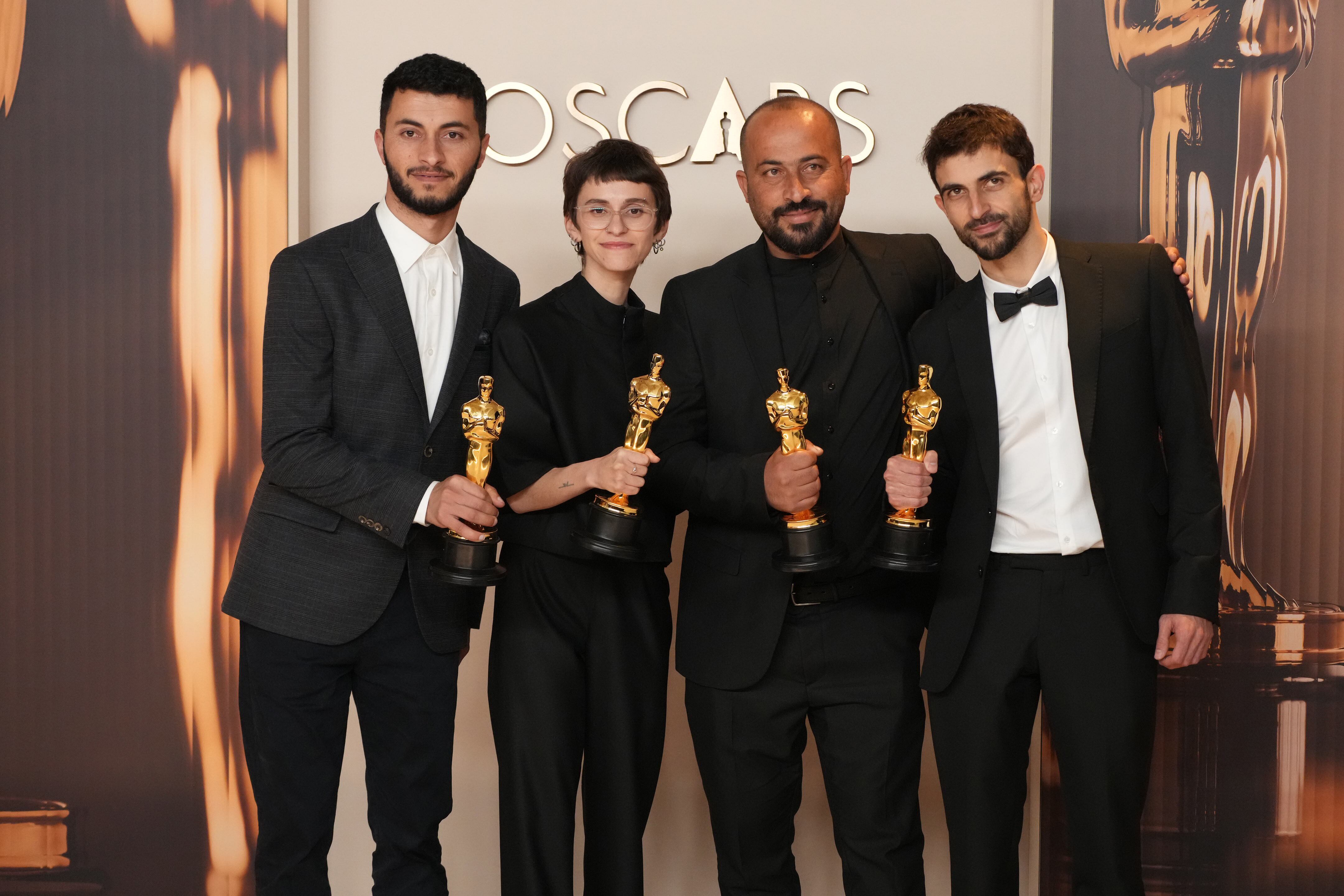 Los representantes del documental 'No Other Land' en los premios Oscar. De izquierda a derecha, Basel Adra, Rachel Szor, Hamdan Ballal y Yuval Abraham / Jeff Kravitz