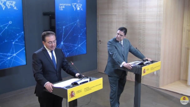 El ministro de Asuntos Exteriores, Unión Europea y Cooperación, José Manuel Albares, y su homólogo marroquí, Nasser Bourita, han comparecido este Jueves Santo en el en el Palacio de Viana, sede del Ministerio, para hacer una declaración institucional, en la que los dos han dado buena cuenta del excelente estado de las relaciones bilaterales: "Es el mejor momento histórico de nuestra relación", subrayaba Bourita.