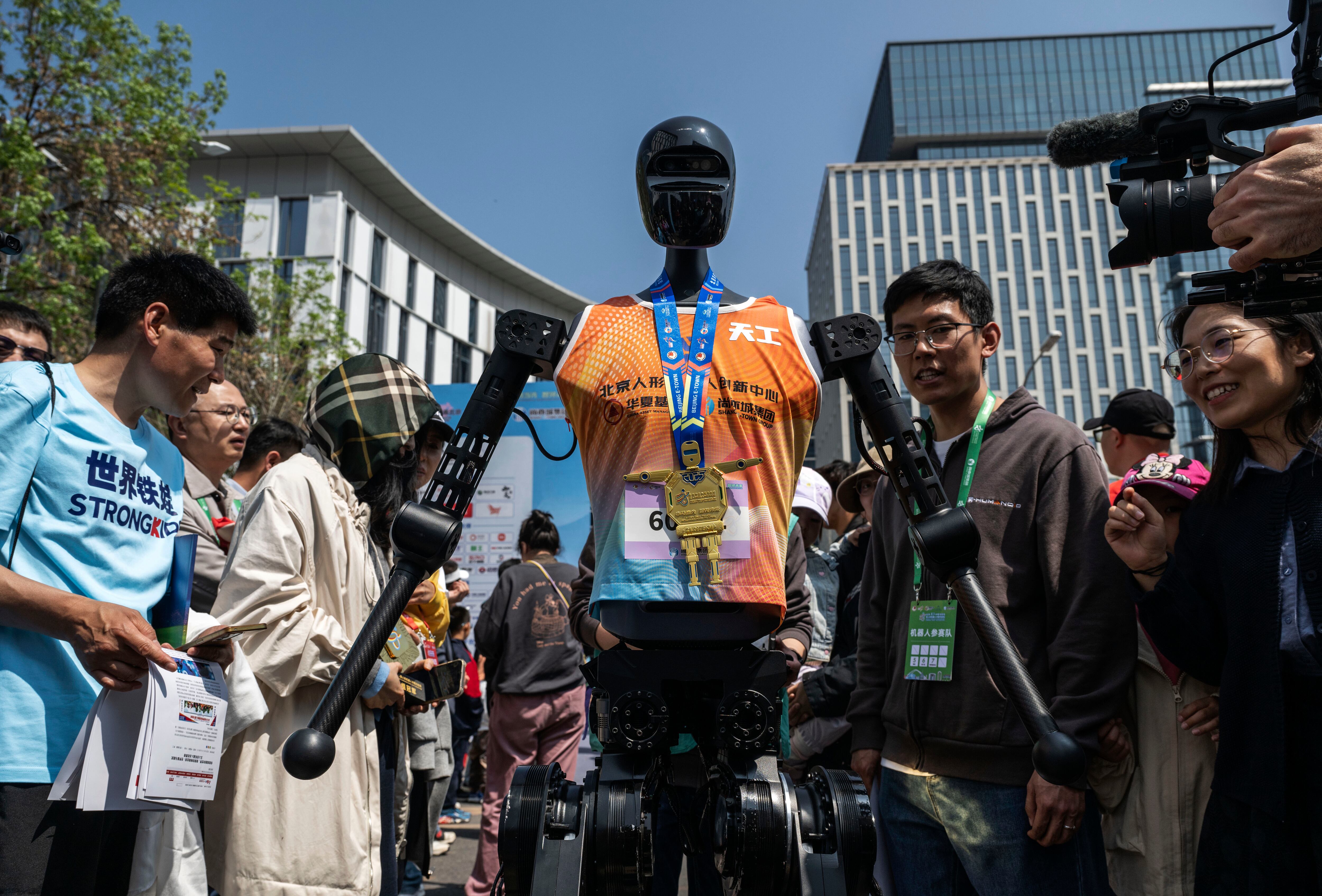 El robot Tiangong luce una medalla mientras camina entre la multitud tras finalizar la Media Maratón el 19 de abril de 2025 en Pekín, China. Kevin Frayer/Getty Images.