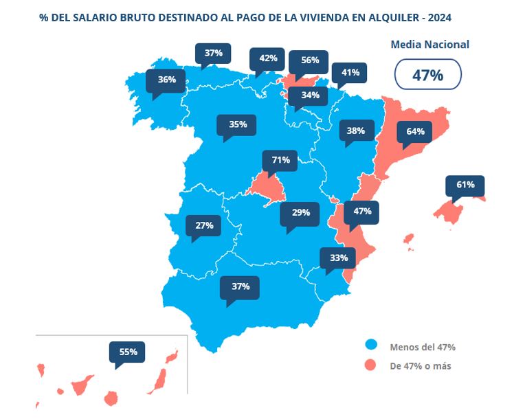 Por provincias, el orden de las 10 que dedican más sueldo al pago del alquiler por una vivienda de 80 metros cuadrados es: Barcelona (71% del sueldo bruto), Madrid (71%), Guipúzcoa (59%), Vizcaya (56%), Girona (55%), Valencia (53%), Málaga (49%), Sevilla (45%) y Alicante (43%).