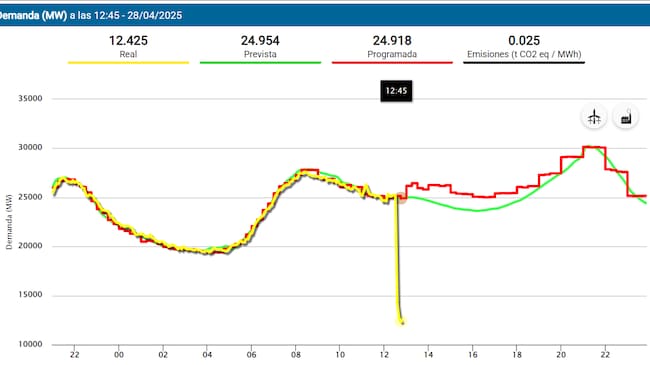 El gráfico muestra la caída en picado del consumo eléctrico, aproximadamente a las 12:30, y, desde entonces, no se ha recuperado.