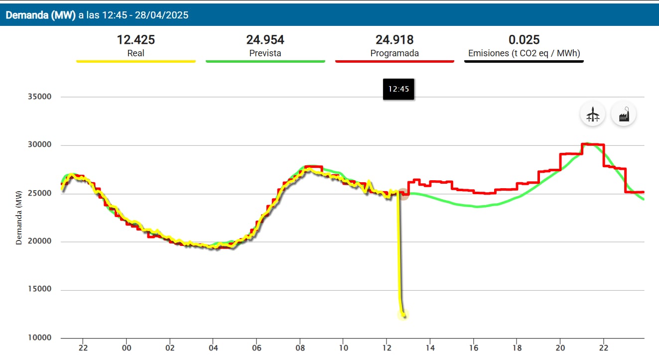 El gráfico muestra la caída en picado del consumo eléctrico, aproximadamente a las 12:30, y, desde entonces, no se ha recuperado.