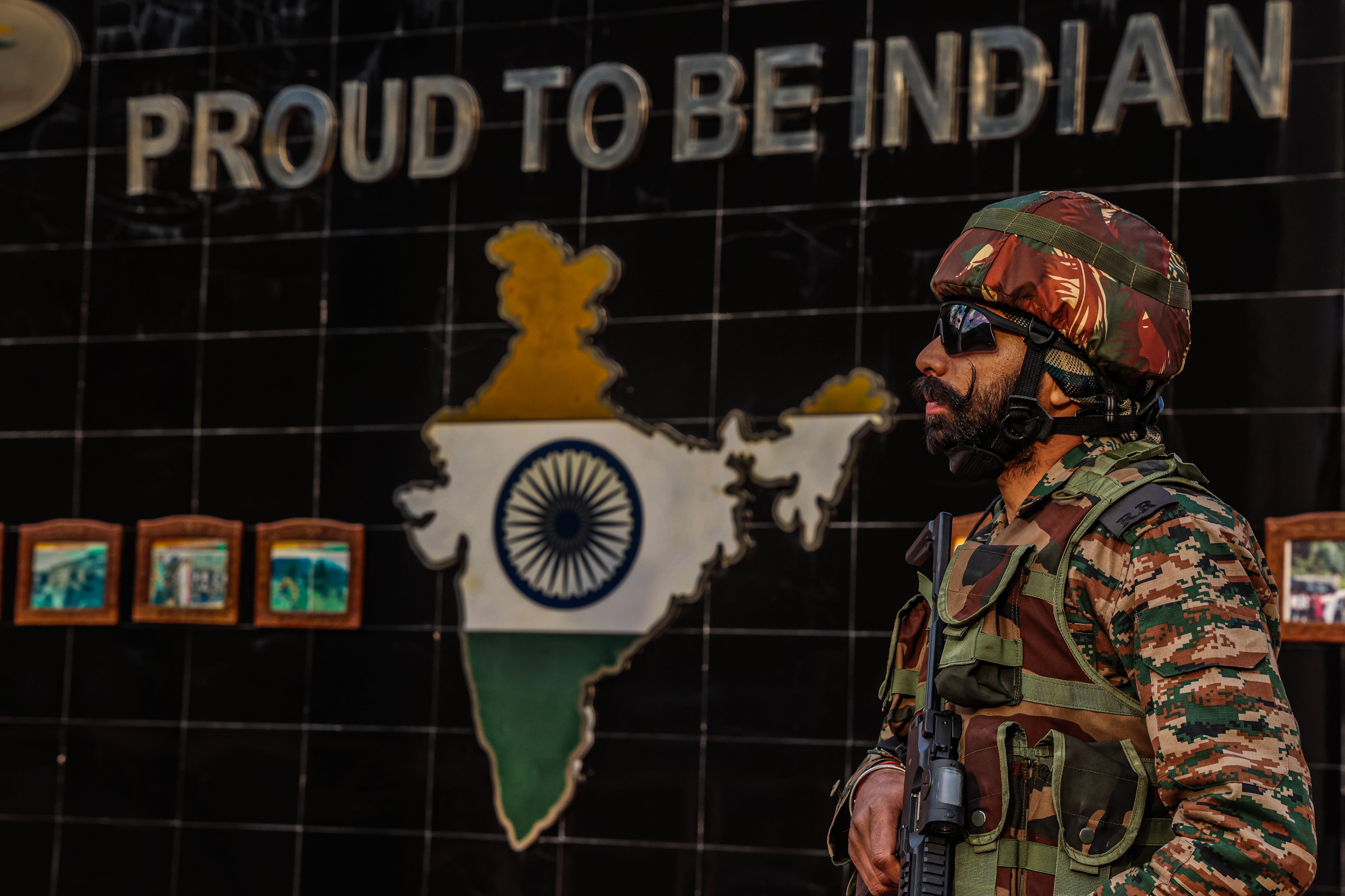 Un soldado indio en Keran, ciudad situada en el territorio de Jammu y Cachemira, junto a un cartel en el que se lee "Orgulloso de ser indio" / NurPhoto