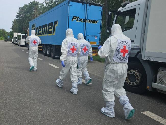 Miembros de la Cruz Roja que han intervenido en la entrega de los cadáveres de los combatientes ucranianos / Centro de Coordinación para el Tratamiento de Prisioneros de Guerra