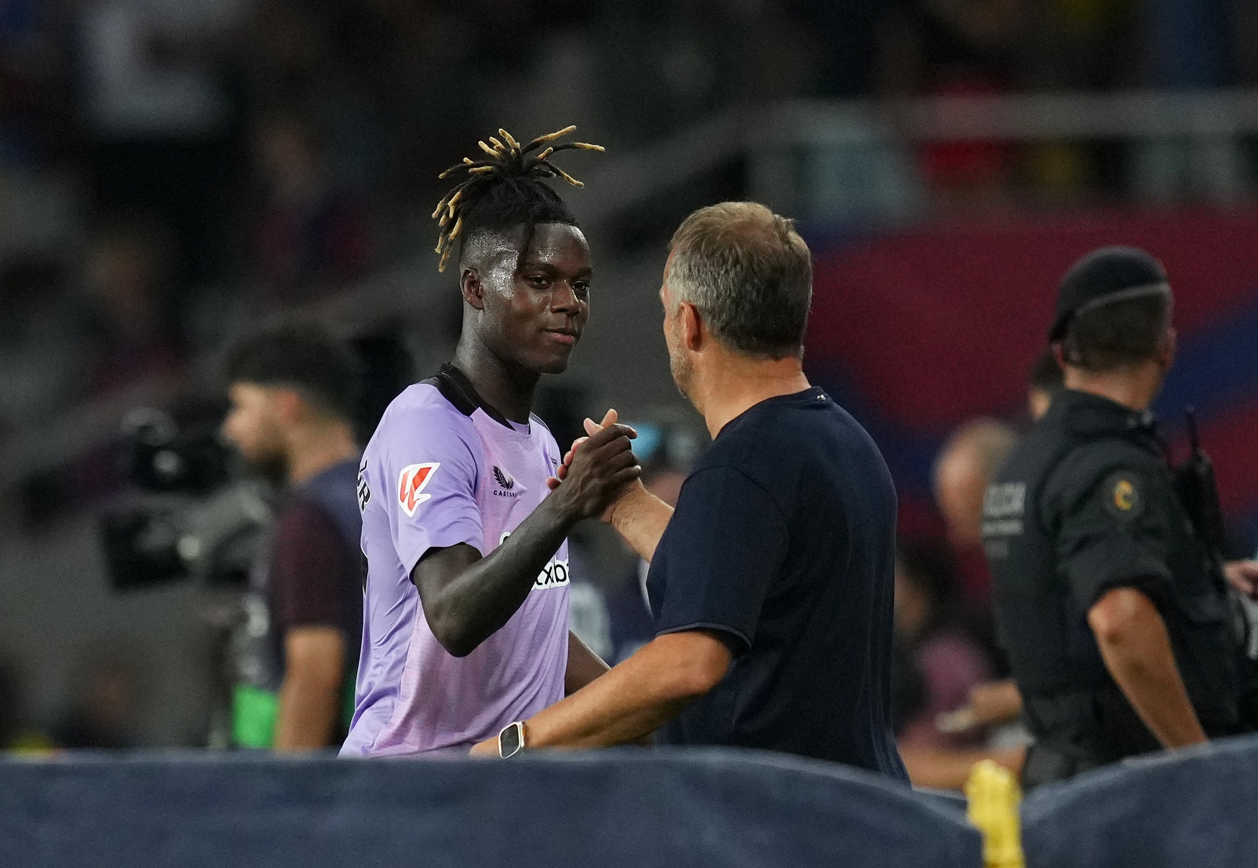 Nico Williams y Hansi Flick se saludan durante el FC Barcelona-Athletic Club de Liga / Alex Caparros