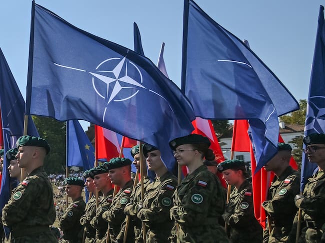 Soldados de Polonia portan banderas de la OTAN y de su país durante un desfile el pasado 15 de agosto / NurPhoto