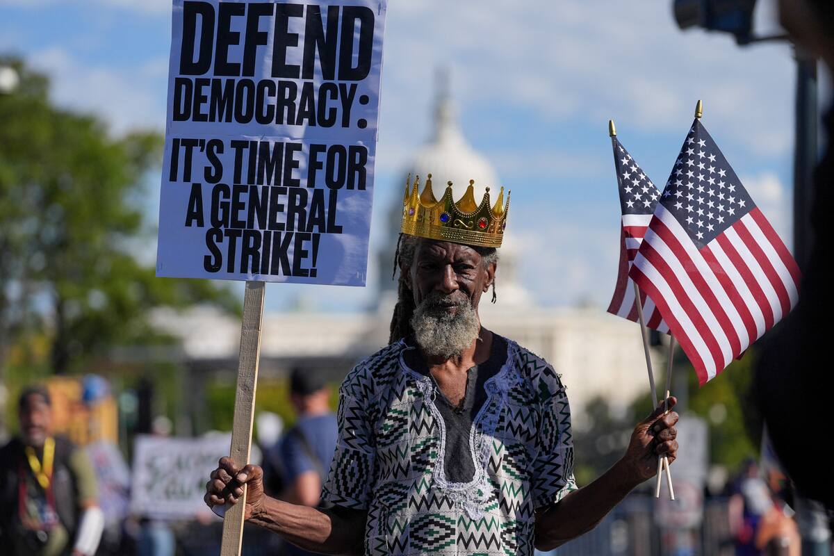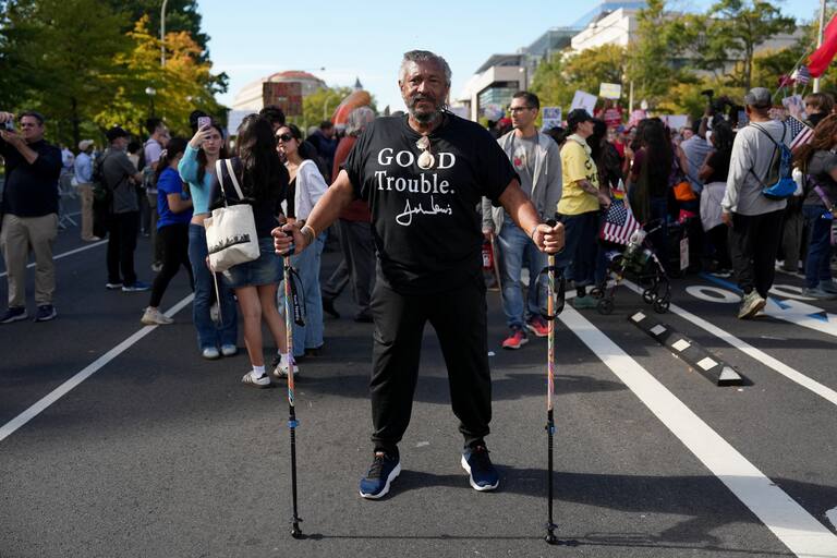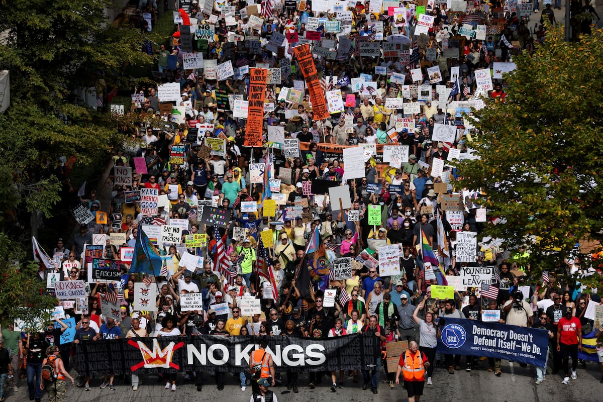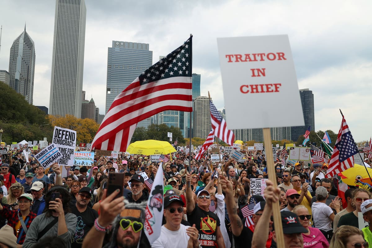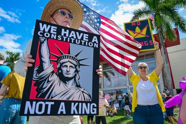 AME9286. WEST PALM BEACH (ESTADOS UNIDOS), 18/10/2025.- Personas participan durante la protesta "No Kings" ("No queremos reyes") este sábado, en West Palm Beach, Florida (Estados Unidos). Miles de personas salen a las calles en ciudades de todo Estados Unidos, entre ellas Nueva York, Washington y Miami, bajo el lema "No Kings", para protestar contra lo que consideran un autoritarismo creciente del presidente Donald Trump. EFE/ Giorgio Viera