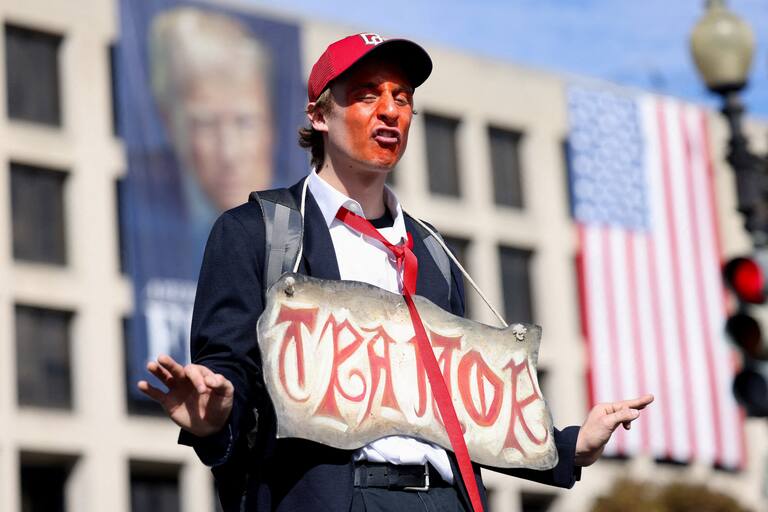 AME9286. WEST PALM BEACH (ESTADOS UNIDOS), 18/10/2025.- Una persona disfrazada con la máscara del presidente Donald Trump, participa durante la protesta "No Kings" ("No queremos reyes") este sábado, en West Palm Beach, Florida (Estados Unidos). Miles de personas salen a las calles en ciudades de todo Estados Unidos, entre ellas Nueva York, Washington y Miami, bajo el lema "No Kings", para protestar contra lo que consideran un autoritarismo creciente del presidente Donald Trump. EFE/ Giorgio Viera