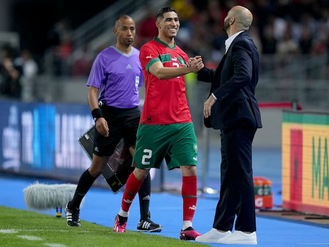 Achraf Hakimi y Walid Regragui se saludan de forma amistosa / Alex Caparros