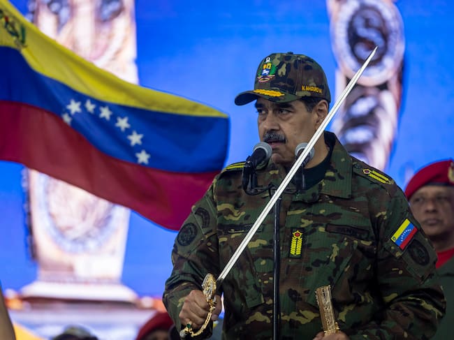 El presidente de Venezuela, Nicolás Maduro, habla sosteniendo la Espada del Perú este martes este martes, en Caracas (Venezuela). / MIGUEL GUTIÉRREZ (EFE)