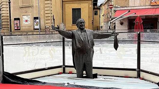 La ciudad de Pésaro, ubicada al norte de Italia, atraviesa esta semana una curiosa polémica a raíz de la situación de una estatua de Luciano Pavarotti. Alrededor del monumento al reconocido tenor italiano, las autoridades locales han construido una pista de hielo, una decisión que ha sido duramente criticada.