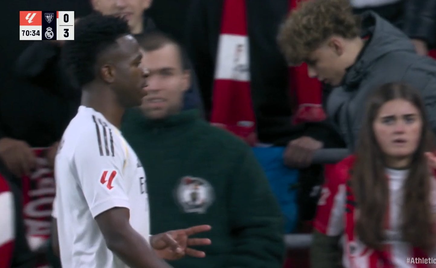 El jugador del Real Madrid aprovechó un momento cerca de la grada para hacer con su mano el gesto de los tres goles que llevaba el Real Madrid en el partido. Todo ello sin siquiera mirar a la afición rival, con la vista al frente mientras hacía un tres con su mano. San Mamés se le vino encima después de esta actitud. Las cámaras de DAZN captaron ese momento y lo enseñaron durante la realización del partido.
