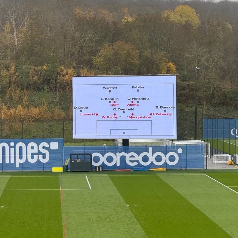 La primera vez que Luis Enrique innovó en sus entrenamientos fue al introducir andamios cuando el técnico asturiano dirigía la Selección. Este elemento le permitía ostentar una mayor perspectiva a la hora de dirigir a sus jugadores; una acción muy similar a la producida durante esta temporada, cuando presenciaba las primeras mitades de los encuentros del PSG desde la grada. Sin embargo, para esta ocasión, 'Lucho' ha apostado por emplear una pizarra gigante en la cual se mostraba una especie de ejercicio de ataque-defensa. En esta se destacan los nombres de varios jugadores defensivos en rojo como Lucas Hernández o Marquinhos, mientras que en color negro resaltaban las figuras de Doué, Barcola o Dembélé; el tridente habitual del cuadro francés.