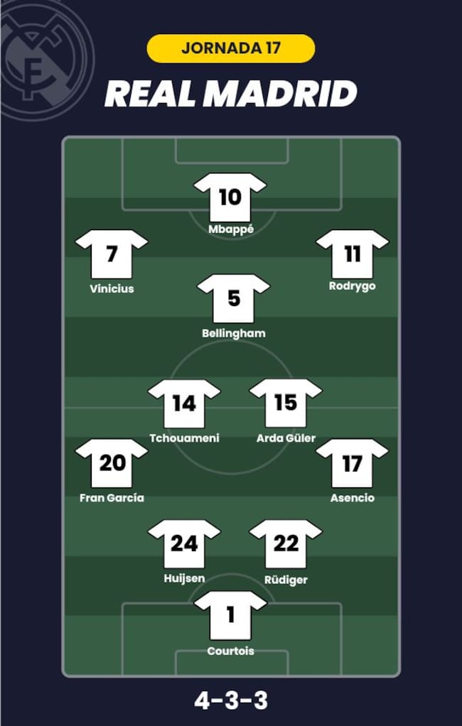 - Real Madrid: Courtois; Asencio, Rüdiger, Huijsen, Fran García; Tchouaméni, Arda Güler, Bellingham; Rodrygo, Vinicius y Mbappé
