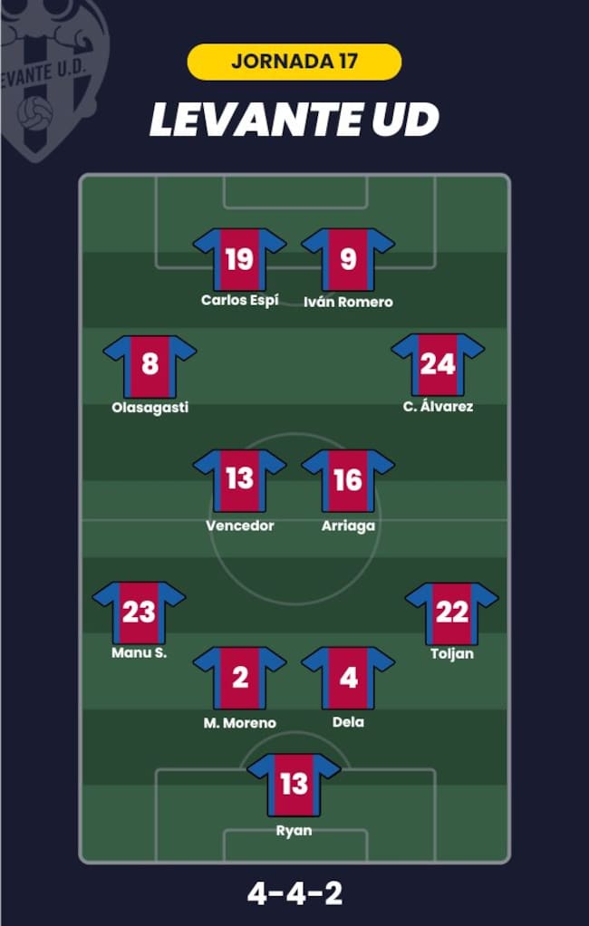 - Levante UD: Ryan; Toljan, Dela, Moreno, Manu Sánchez; Arriaga, Vencedor, Carlos Álvarez, Olasagasti; Iván Romero y Carlos Espí