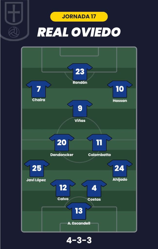 - Real Oviedo: Aarón; Ahijado, Calvo, Costas, Javi López; Dendoncker, Colombatto, Viñas; Hassan, Chaira y Rondón