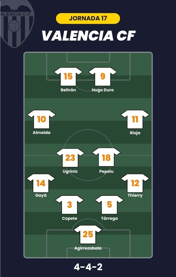 - Valencia CF: Agirrezabala; Thierry, Tárrega, Copete, Gayá; Pepelu, Ugrinic, Rioja, Almeida; Beltrán y Hugo Duro