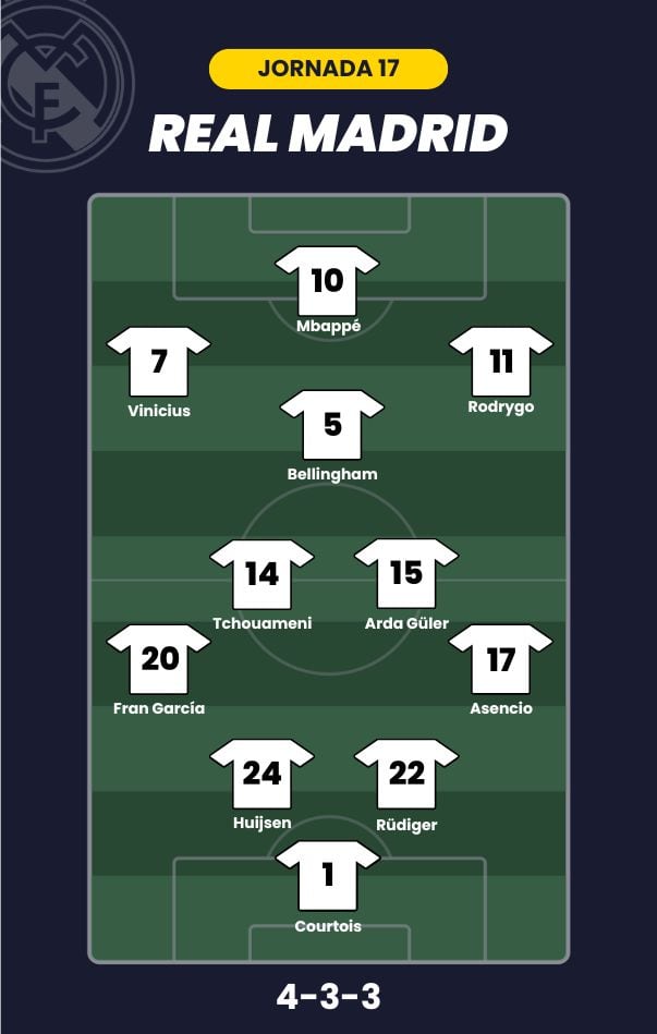 - Real Madrid: Courtois; Asencio, Rüdiger, Huijsen, Fran García; Tchouaméni, Arda Güler, Bellingham; Rodrygo, Vinicius y Mbappé