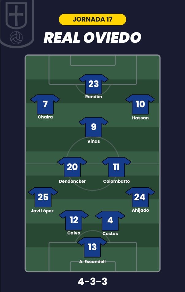 - Real Oviedo: Aarón; Ahijado, Calvo, Costas, Javi López; Dendoncker, Colombatto, Viñas; Hassan, Chaira y Rondón