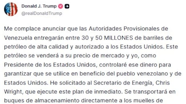 El inquilino de la Casa Blanca ha indicado en el mismo mensaje que este crudo "se venderá a su precio de mercado, y ese dinero será controlado por mí, como presidente de Estados Unidos, para garantizar que se utilice en beneficio de los pueblos de Venezuela y Estados Unidos".