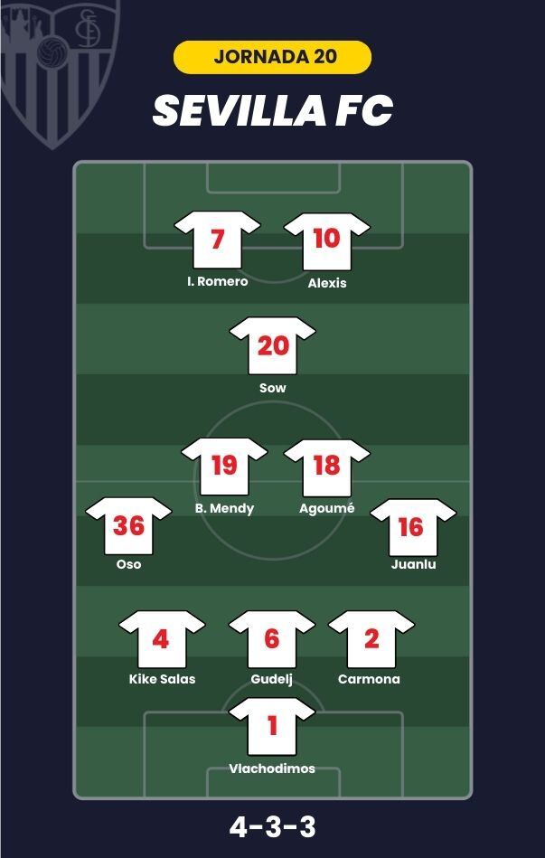 - Sevilla FC: Vlachodimos; Juanlu, Carmona, Gudelj, Kike Salas, Oso; Mendy, Agoumé, Sow; Alexis Sánchez e Isaac Romero