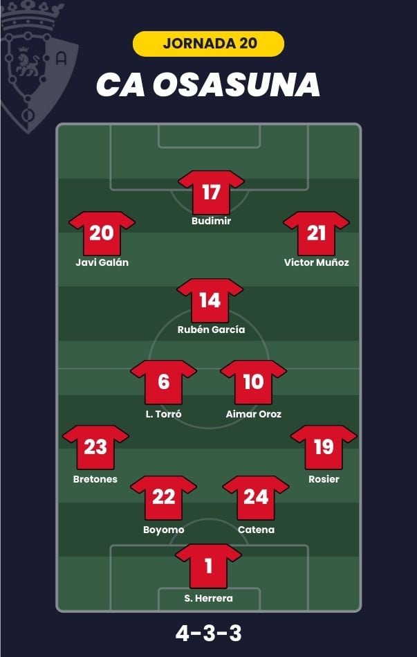 - CA Osasuna: Herrera; Rosier, Catena, Boyomo, Bretones; Torró, Aimar Oroz; Víctor Muñoz, Rubén García, Javi Galán; y Budimir