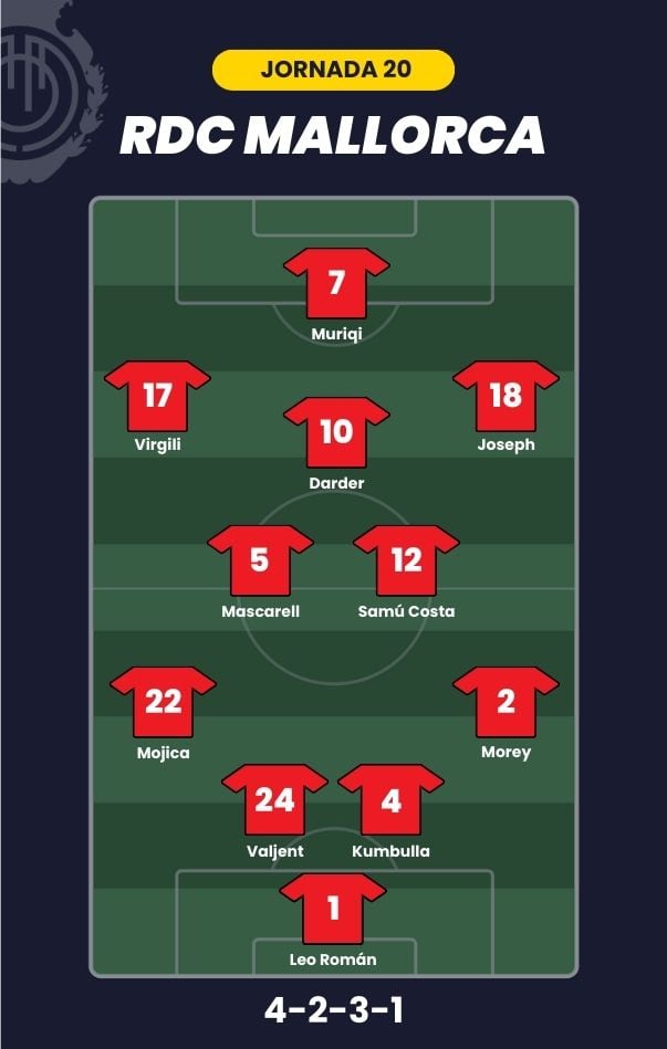 - RCD Mallorca: Leo Román; Morey, Valjent, Kumbulla, Mojica; Samú Costa, Mascarell, Darder; Joseph, Virgili y Muriqi