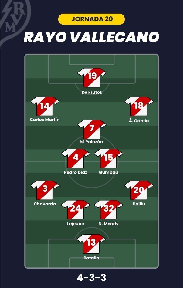 - Rayo Vallecano: Batalla; Balliu, Lejeune, Nobel Mendy, Pep Chavarría; Pedro Díaz, Gumbau; Isi Palazón, Álvaro García, Carlos Martín; y De Frutos