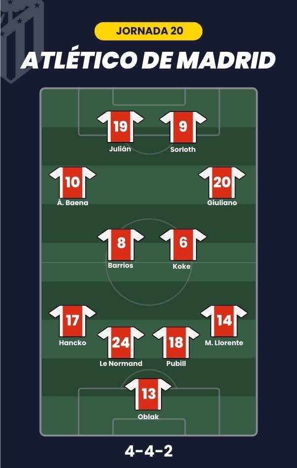 - Atlético de Madrid: Oblak; Marcos Llorente, Marc Publill, Le Normand, Hancko; Koke, Pablo Barrios, Giuliano, Álex Baena; Julián Álvarez y Sorloth