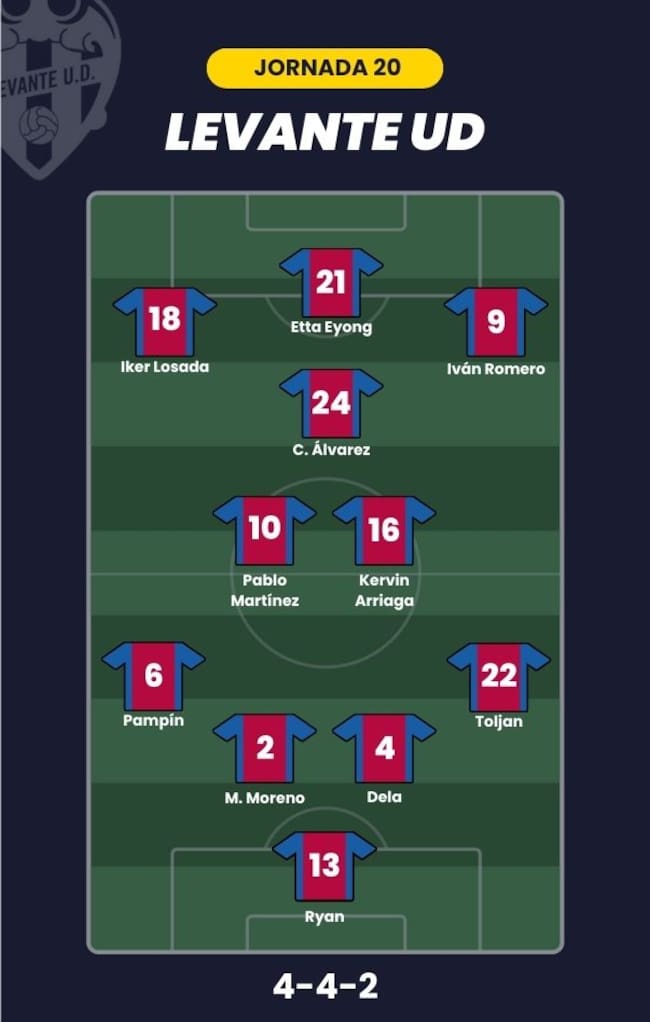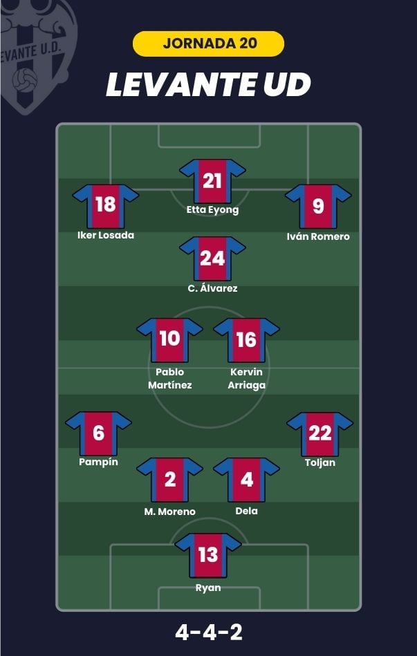 - Levante UD: Ryan; Toljan, Dela, Moreno, Pampín; Arriaga, Pablo Martínez, Carlos Álvarez; Losada, Iván Romero y Etta Eyong