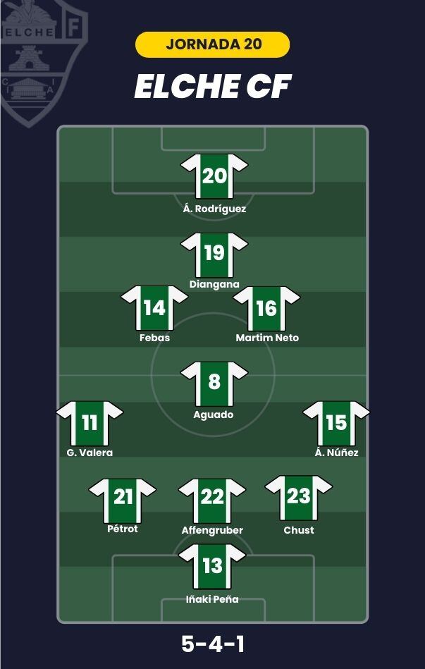 - Elche CF: Iñaki Peña; Álvaro Núñez, Víctor Chust, Affengruber, Pétrot, Germán Valera; Aguado, Febas, Martim Neto, Diangana; y Álvaro Rodríguez