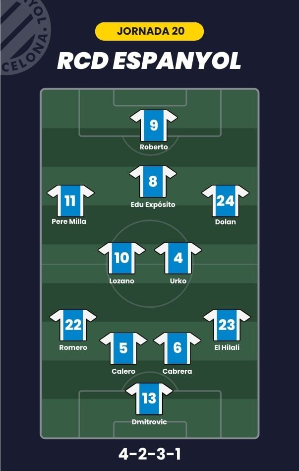 - RCD Espanyol: Dmitrovic; El Hilali, Cabrera, Calero, Romero; Urko, Edu Expósito, Lozano; Dolan, Pere Milla y Roberto