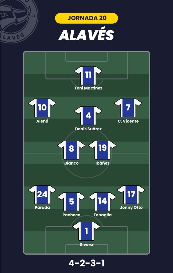 - Deportivo Alavés: Sivera; Jonny Otto, Tenaglia, Pacheco, Parada; Blanco, Ibáñez, Denis Suárez; Carlos Vicente, Aleñá y Toni Martínez