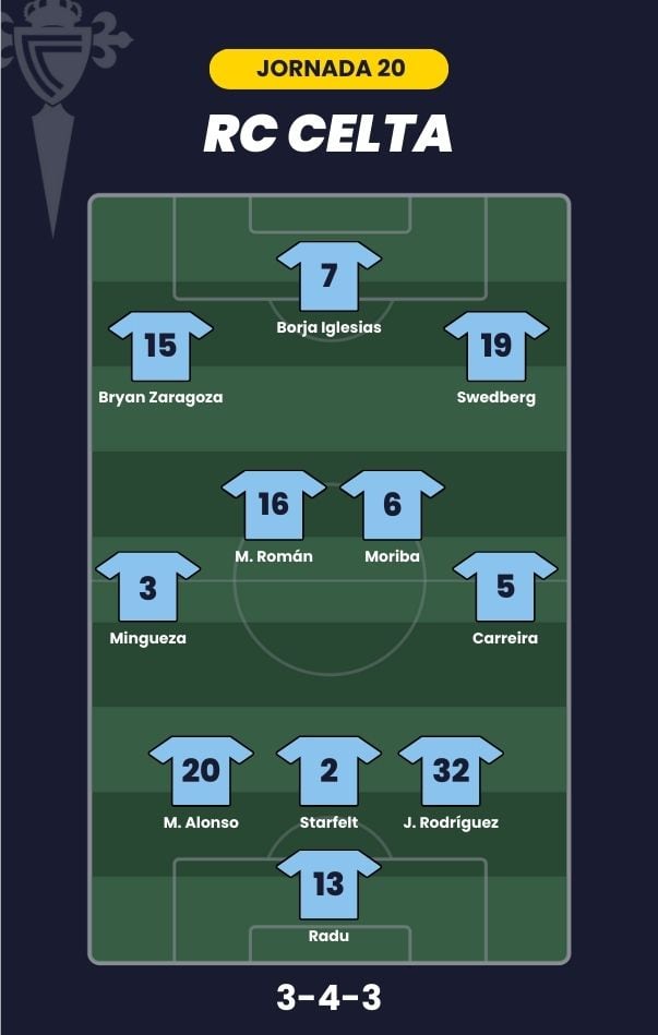 - Celta de Vigo: Radu; Carreira, Javi Rodríguez, Starfelt, Marcos Alonso, Mingueza; Román, Ilaix Moriba; Swedberg, Bryan Zaragoza y Borja Iglesias