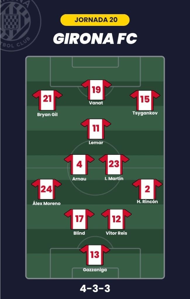 - Girona FC: Gazzaniga; Hugo Rincón, Vitor Reis, Blind, Álex Moreno; Arnau Martínez, Iván Martín, Lemar; Tsygankov, Bryan Gil; y Vanat