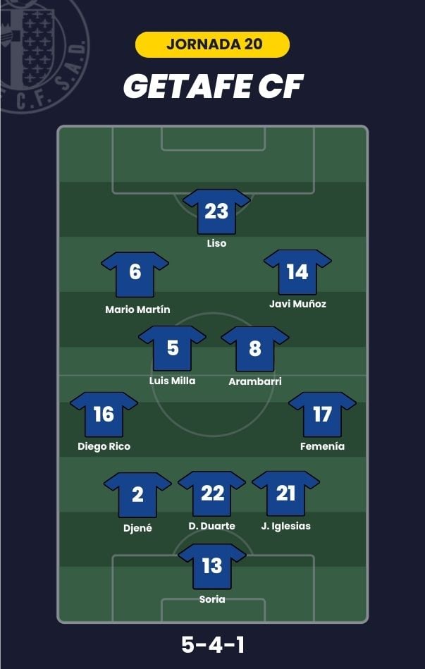 - Getafe CF: Soria; Femenía, Juan Iglesias, Domingos Duarte, Djené, Diego Rico; Luis Milla, Arambarri, Mario Martín, Javi Muñoz; y Adrián Liso