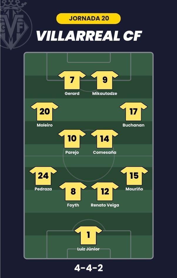 - Villarreal CF: Luiz Junior; Mouriño, Foyth, Renato Veiga, Pedraza; Comesaña, Parejo, Buchanan, Moleiro; Gerard Moreno y Mikautadze