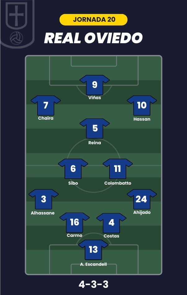 - Real Oviedo: Aarón; Ahijado, Costas, Calvo, Alhassane; Colombatto, Sibo, Reina; Hassan, Chaira y Viñas