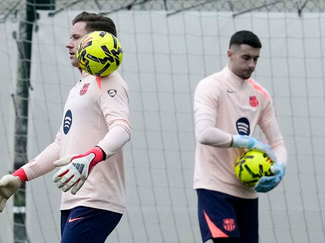 Joan Garcia y Ter Stegen, durante el entrenamiento del primer equipo del FC Barcelona / Enric Fontcuberta (EFE)